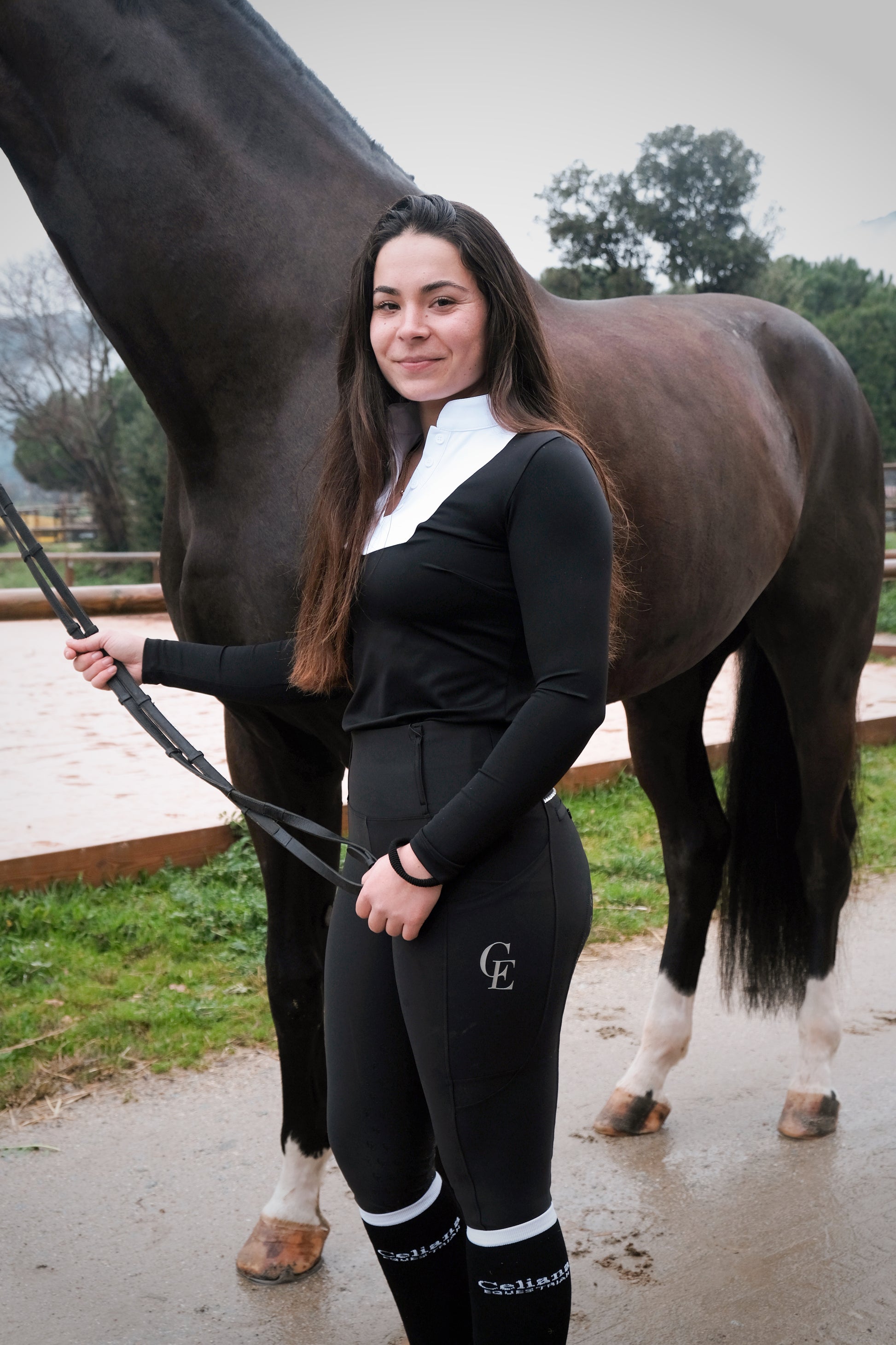 Conçu pour sublimer la silhouette, ce top d’équitation de concours associe une coupe ajustée à un contraste noir et blanc chic, parfaitement étudié pour mettre en valeur la posture et l’allure de la cavalière. Son col droit athlétique-chic apporte une ligne moderne et structurée, offrant une apparence soignée et élégante, en parfaite adéquation avec les exigences de la compétition.